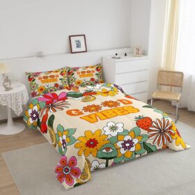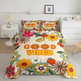 1960’s 1970’s Comforter Set for Adult,Disco Hippie Indie Flower Bedding Set Twin Size,Colorful Summer Floral Quilt Set,Hawaii Groovy Garden Floral Duvet Insert with 1 Pillow Sham Bedroom Decor