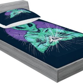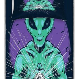 Ambesonne Alien Fitted Sheet & Pillow Sham Set, Retro Extra-Terrestrial Character with Eye Triangle Illustration Art, Decorative Printed 2 Piece Bedding Decor Set, Twin, Navy Blue Violet Seafoam