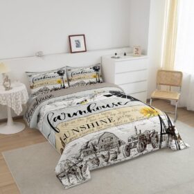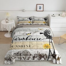 2Pcs Farmhouse Windmill Comforter Set Cabin Decor, Cow Cattle Farm Animal Bedding Set Twin, Sunflower Butterfly Rustic Comforter Windmill Decor, Positive Inspirational Quotes Country Down Comforter