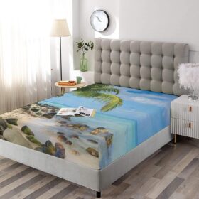 Decorative Bedding Sheet Set Twin XL Size, Seaside Deep Pockets Fitted Sheet & 2 Pillow Sham Set, Romantic Beach Palm Trees on Caribbean Island Print Microfiber 3pc Bed Sheets Set