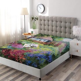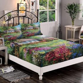 Decorative Bedding Sheet Set Twin XL Size, Rustic Deep Pockets Fitted Sheet & 2 Pillow Sham Set, Stone House and Garden Wooden Fence Colorful Spring Flowers Print Microfiber 3pc Bed Sheets Set
