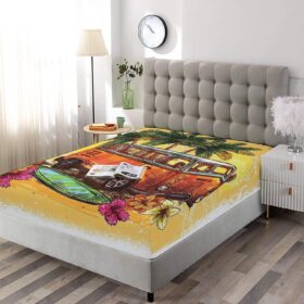 Decorative Bedding Sheet Set Twin XL Size, Surf Decor Deep Pockets Fitted Sheet & 2 Pillow Sham Set, Hippie Classic Old Bus with Surfboard Sketch Art Print Microfiber 3pc Bed Sheets Set,for Mattress