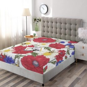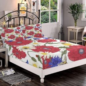 Decorative Bedding Sheet Set Twin XL Size, Vintage Deep Pockets Fitted Sheet & 2 Pillow Sham Set, Summer Floral Red Poppies Chamomile Ladybird Daisies Cornflowers Bumble Bee Print 3pc Bed Sheets Set