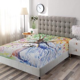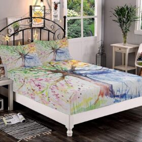 Decorative Bedding Sheet Set Twin XL Size, Tree Deep Pockets Fitted Sheet & 2 Pillow Sham Set, Watercolor Artistic Tree Colorful Blooming Branches Seasons Print Microfiber 3pc Bed Sheets Set