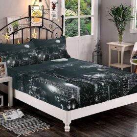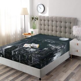 Decorative Fitted Sheet Set Twin Size, Modern Deep Pockets Fitted Sheet & 2 Pillow Sham Set, Aerial View of Hong Kong City at Night with Full Moon Printed Microfiber Bedding 3pc Set,for Mattress