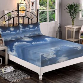 Decorative Fitted Sheet Set Twin Size, Ocean Deep Pockets Fitted Sheet & 2 Pillow Sham Set(No Flat Sheet), Mystic Full Moon Cloudscape Printed Microfiber Bedding 3pc Set, for Mattress (Deep: 5