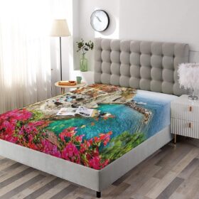 Decorative Fitted Sheet Set Twin Size, Italy Deep Pockets Fitted Sheet & 2 Pillow Sham Set, Monarola Antique Village in Cinque Terre Coastal Summer Beach Scenic Printed Microfiber Bedding 3pc Set