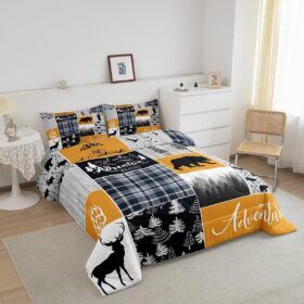 Deer Bear Twin Bedding Sets, Blue And Grey Buffalo Plaid Comforter Set Woodland Animal Wildlife Quilt Hunting Lodge Country Down Comforter Rustic Farmhouse Cabin Bathroom Decor, 1 Pillow Case