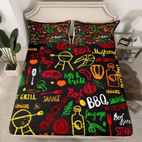Delicious Food Bed Sheet Set Hand Draw Meat Fruits Food Fitted Sheet for Ultra Soft Barbecue Bedding Cover Set Room Decor Queen (No Flat Sheet)