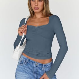 Trendy Queen Womens Long Sleeve Going Out Crop Tops Sweetheart Neck Cute Y2k T Shirts Side Slit Tees