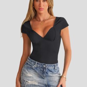 Trendy Queen Womens Deep V-Neck Backless Tops Short Sleeve Slim Fit T-Shirts Basic Y2K Tops Bustier Corset Cami 2025