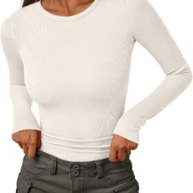 AUTOMET Womens Ribbed Shirts Crewneck Fitted Tops Casual Underscrubs Layer Slim Basic T-Shirts