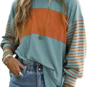 Dokotoo Long Sleeve Spring Tops Oversized 2025 Trendy Round Crew Neck Casual Color Block Womens Shirts Blouses