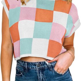 Saodimallsu Womens Cap Sleeve Crop Tops Summer Color Block Going Out Crew Neck Knit Trendy Casual Sweater