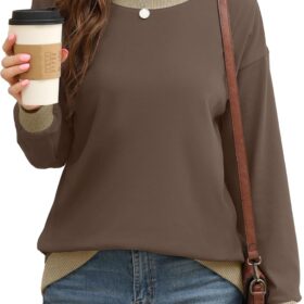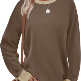 Saloogoe Sweatshirts for Women Crewneck Long Sleeve Loose Fit Tops Color Block Ribbed Trim Fashion 2024