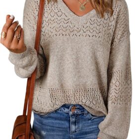 SHEWIN Womens Sweaters Casual Long Sleeve V Neck Lightweight Crochet Pullover Sweater Tops