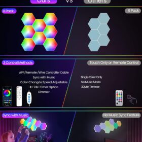 8 Pack Hexagon Led Lights Wall Panels: RGB Gaming Lights with APP Smart Modular Panel Hex Tiles Push Glide Expansion Shapes Lights
