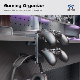 3-in-1 PC Gaming Headset&Controller Holder – EURPMASK Headphone Stand w/Adjustable Clamp&2 Controller Holder&Rotating Arm&Cable Organizer, Universal PC Gaming Accessory Controller Headset Stand-Black