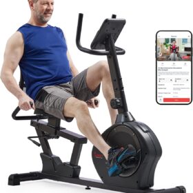 Sunny Health & Fitness Smart Heavy-Duty Recumbent Bike w/Wide Cushioned Seat & Back, Indoor Cycling Machine for Adult/Seniors Home Exercise, Free SunnyFit App Connect, Optional Workout Training Bands