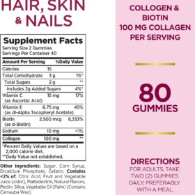 Nature’s Bounty Optimal Solutions Hair, Skin & Nails with Biotin and Collagen, Citrus-Flavored Gummies Vitamin Supplement, 2500 mcg, 80 Ct