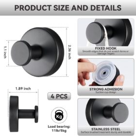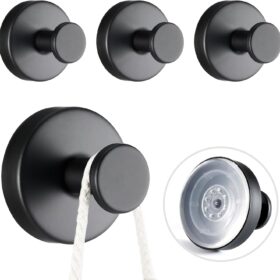 4 PCS Suction Cup Hooks for Shower, Stainless Steel No Drill Suction Towel Hooks, Reusable Sticky Silicone Suction Cup Base for Bathroom Wall, Glass, Mirror, Tile to Hang Loofahs, Robes (matt Black)