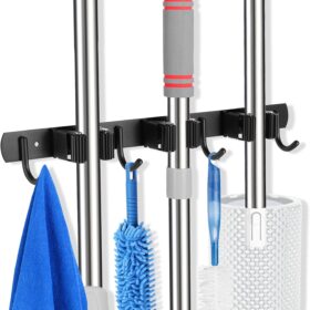 voze 3 Racks and 4 Hooks Mop and Broom Holder Wall Mount, Self Adhesive Heavy Duty Broom Organizer Storage Tool Racks for Kitchen Garden Laundry Garage