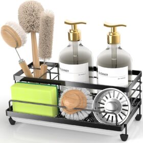 Cisily Sponge Holder for Kitchen, Sink Organizer, Kitchen Sink Accessories with Drip Tray, Rustproof and Non-Slip, Sponge Holder, Kitchen Utensils for New Home (Matte Black)