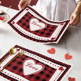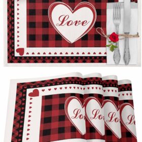 Valentines Placemat Heart Shape Design Place Mats for Dining Room Dinner Table Red Buffalo Check Plaid Romantic Love Valentine’s Day Washable Table Mats Kitchen Decorations Set of 4