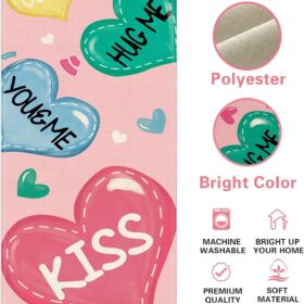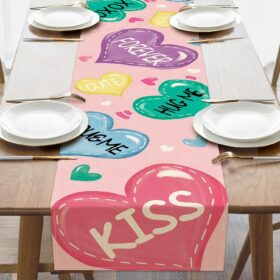 Valentines Day Colorful Love Hearts Table Runner, Forever Kiss Kitchen Dining Table Decoration, Anniversary School Classroom Burlap Indoor Outdoor Home Decor Party Supply 13 x 36 Inches