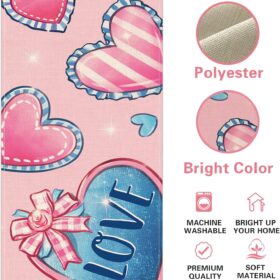 Valentines Day Love Table Runner, Pink Blue Hearts Stripes Kitchen Dining Table Decoration, Anniversary Wedding Burlap Indoor Outdoor Home Decor Party Supply 13 x 36 Inches