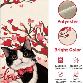 Valentines Day Tuxedo Cat Table Runner, Pink Red Love Hearts Tree Kitchen Dining Table Decoration Pet Lover Gift, Anniversary Wedding Burlap Indoor Outdoor Home Decor Party Supply 13 x 36 Inches