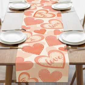 Valentines Day Love Table Runner, Peach Pink Hearts Kitchen Dining Table Decoration, Anniversary Wedding Burlap Indoor Outdoor Home Decor Party Supply 13 x 36 Inches