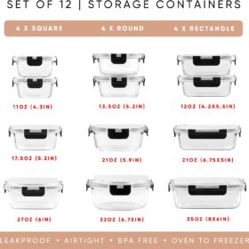 JoyJolt JoyFul 24pc(12 Airtight, Freezer Safe Food Storage Containers and 12 Lids), Pantry Kitchen Storage Containers, Glass Meal Prep Container for Lunch, Glass Storage Containers with Lids
