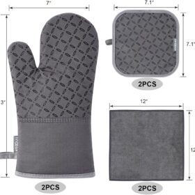 KEGOUU Oven Mitts and Pot Holders 6pcs Set, Kitchen Oven Glove High Heat Resistant 500 Degree Extra Long Oven Mitts and Potholder with Non-Slip Silicone Surface for Cooking (Grey)