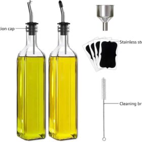 Olive Oil Dispenser Bottle, 2 Pcs Glass Olive Oil Dispenser and Vinegar Dispenser Set with 2 Stainless Steel Pourers, 4 Labels,1 Brush and 1 Funnel Oil Bottles for Kitchen (500ml)