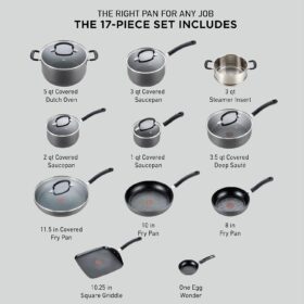 T-fal Ultimate Hard Anodized Nonstick Cookware Set 17 Piece, Oven Broiler Safe 400F, Lid Safe 350F, Kitchen Cooking Set w/ Fry Pans, Saucepans, Saute Pan, Griddle, Pots and Pans, Dishwasher Safe Black
