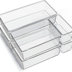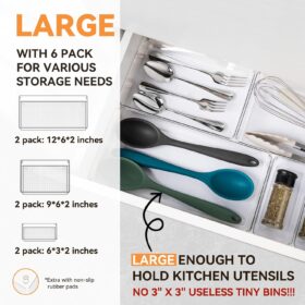 6 Pack Large Clear Plastic Drawer Organizer Trays, Acrylic Kitchen Drawer Organization and Storage Dividers, Non-Slip Storage Bins for Makeup, Kitchen Utensils, Bathroom, Jewelries and Office Desk