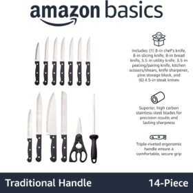 Amazon Basics 14-Piece High Carbon Stainless Steel Kitchen Knife Set with Sharpener and Pinewood Block, Black