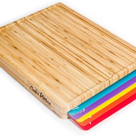 Bamboo Cutting Board Set – Easy-to-Clean Wood Cutting Board Set with 6 Color-Coded Flexible Plastic Cutting Boards with Food Icons – Wooden Cutting Boards For Kitchen – Wooden Chopping Board Set
