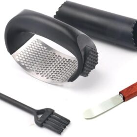 Garlic Press Rocker, Portable Manual Stainless Steel Garlic Press Rocker Crusher Masher with Garlic Peeling Drum for Home Kitchen Utensils (Black)