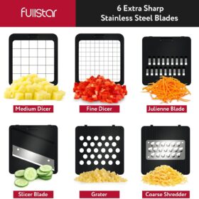 Fullstar All-in-1 Vegetable Chopper, Mandoline Slicer & Cheese Grater – French Fry Cutter & Veggie Dicer – Cheese Slicer – Includes Bonus Handheld Spiralizer (6 in 1, Black/White)