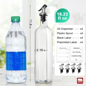 GMISUN Oil Dispenser for Kitchen, 4Pack Oil Bottles for Kitchen, 17oz Cooking Oil Dispenser Bottle, Glass Oil Container with Plastic Pourer, Oil Cruet with Plastic Funnel and Labels for Vegetable