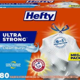 Hefty Ultra Strong 13 Gallon Trash Bags, Tall Kitchen Trash Bags 13 Gallon Size, Drawstring Closure, Continuous Odor Control, White, Clean Burst Scent, 80 Bags
