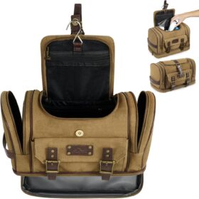 ARCFOX Hanging Travel Toiletry Bag for Men, Canvas Travel Hanging Toiletry Bag Set with 7 Compartments, Large Toiletry Bag for Men, Travel Bags for Toiletries, Camping Gym Travel Toiletries Kit,Brown