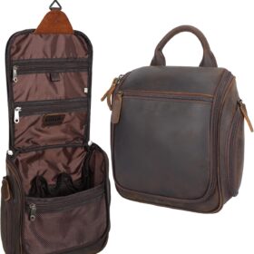 Masa Kawa Leather Hanging Travel Toiletry Bag for Men Portable Expandable Camping Cosmetics Makeup Toiletries Organizer Vintage Bathroom Shaving Kit Brown Wash Bags