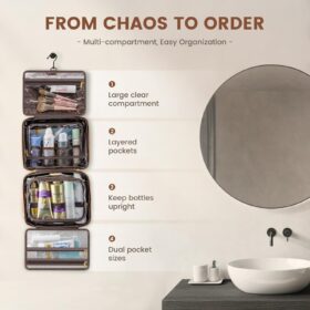 LOVEVOOK Travel Toiletry Bag with Hanging Hook for women, Water-Resistant Leather Vintage Makeup Cosmetic Bag Organizer for Accessories, Shampoo, Toiletries, Brown