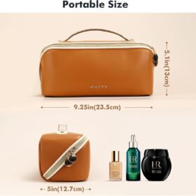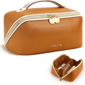Prite Travel Cosmetic Bag Makeup Organizer Bag For Women Large Capacity Waterproof PU Leather Toiletry Bag with Jacquard Ribbon Handle and Clear Divider(New Brown)