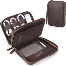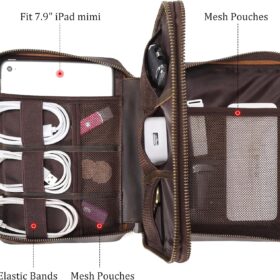 Polare Full Grain Leather Travel Cable Organizer Case Double Layer Electronics Accessories Carry Bag with YKK Zippers Tech Storage Bag for Cables, Power Bank, USB, SD Card