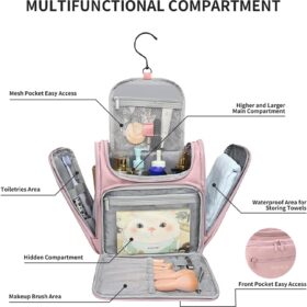 BOOMRICH Large Toiletry Bag for Women, Hanging Leather Travel Makeup Bag with 360° Hook and Shoulder Strap, Travel Organizer for Full Sized Container, Toiletries, Brushes (Pink)