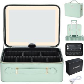 Leather Makeup Case with LED Lighted Mirror 11.4 Inch Travel Makeup Bag Adjustable Brightness in 3 Colors Cosmetic Organizer Artist Storage Bag with Dividers Brush Holder Bag Present Box Watery Blue